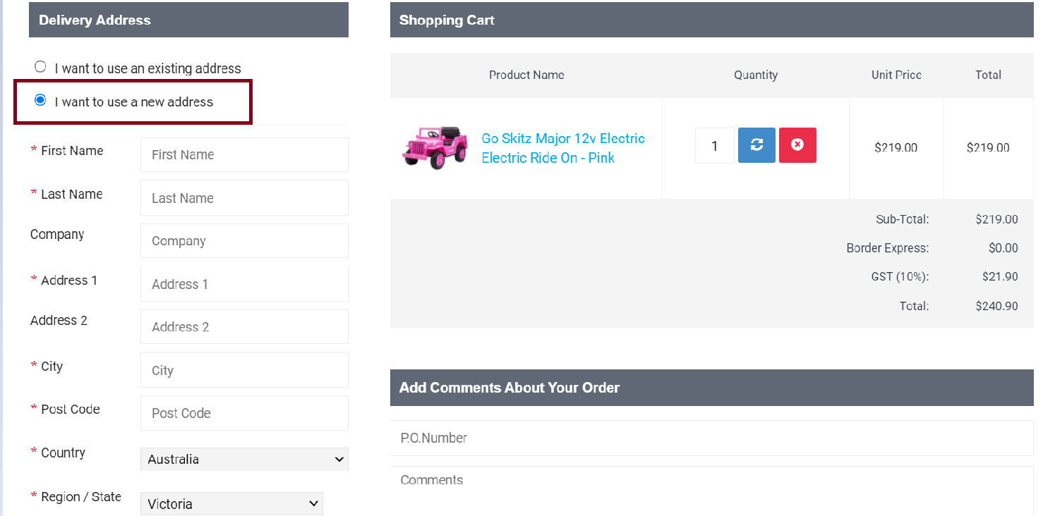 In the Delivery Address page, always choose “I want to use a new address”