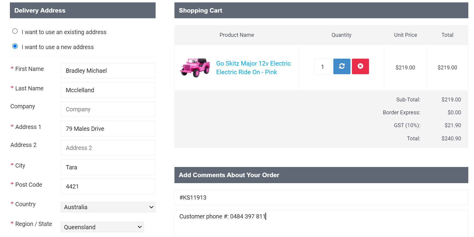 Add customer details. Enter the KS order number in the PO Number box. Add the customer phone number in the Comment section.