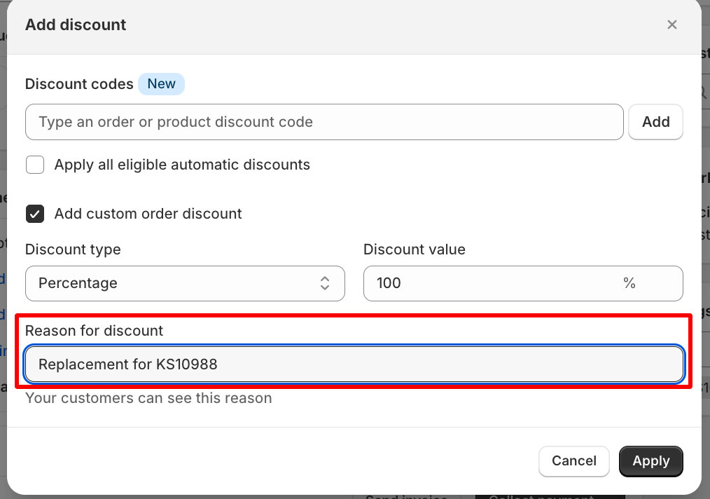 Click Add Discount. Choose Percentage and enter a 100% discount for spare parts that are covered under warranty / no cost. Click Apply.