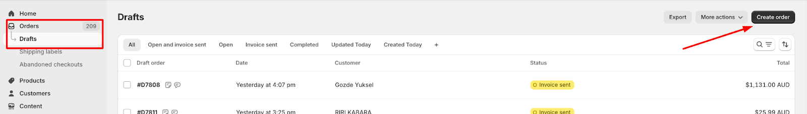 Go to your store’s Shopify account and from the Menu options go to Orders and choose Drafts. After that, click the Create Order button on the top left-hand side of your screen.